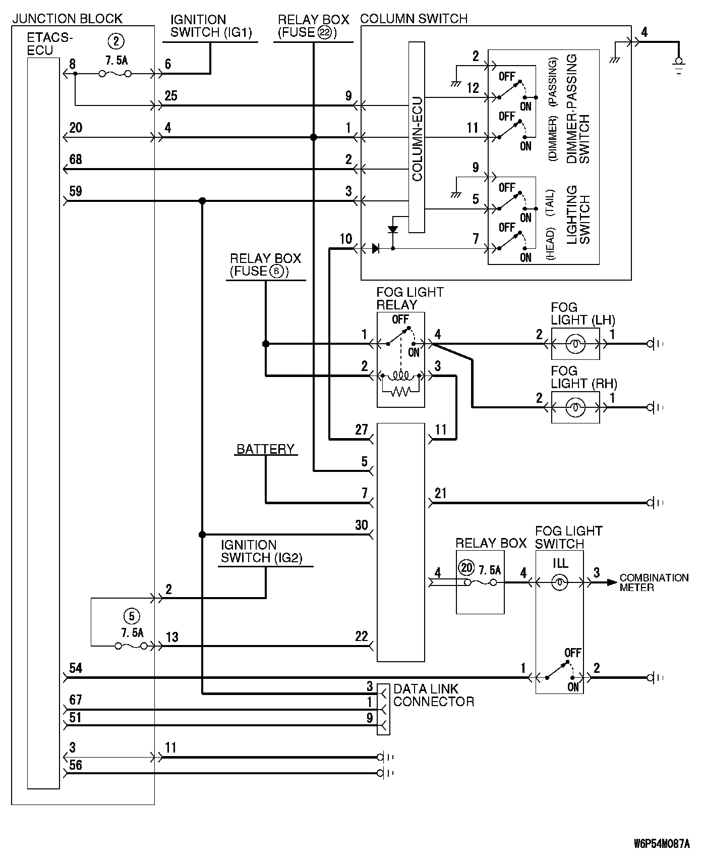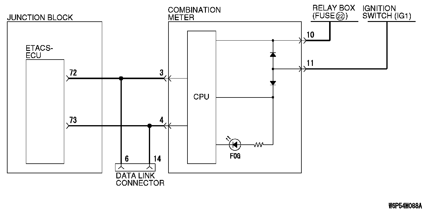 At the same time that the front fog lights are illuminated, the ETACS-ECU sends a signal to illuminate the front fog light indicator via the CAN bus line. The combination meter receives the transmitted signal and turns the front fog light indicator on and off.