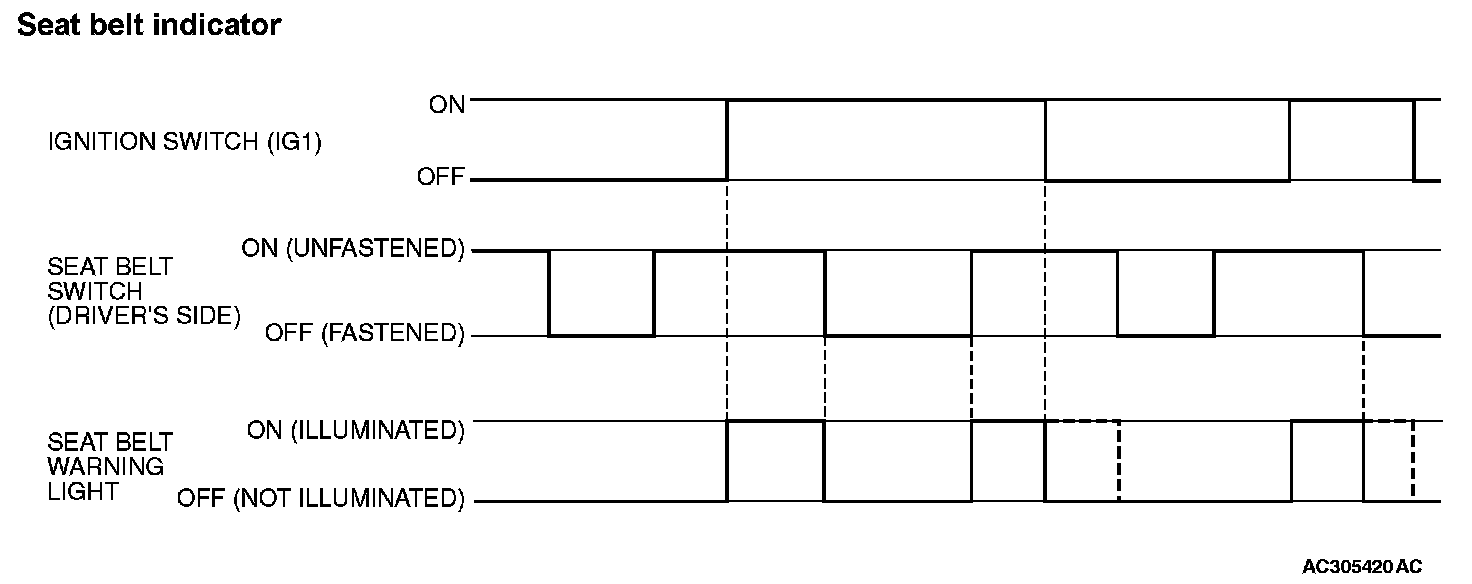If any of the following conditions are met with the ignition switch at "ON" or "ST", the ETACS-ECU illuminates or extinguishes the seat belt indicator by using the driver's seat belt switch signal and the vehicle speed signal from the combination meter.