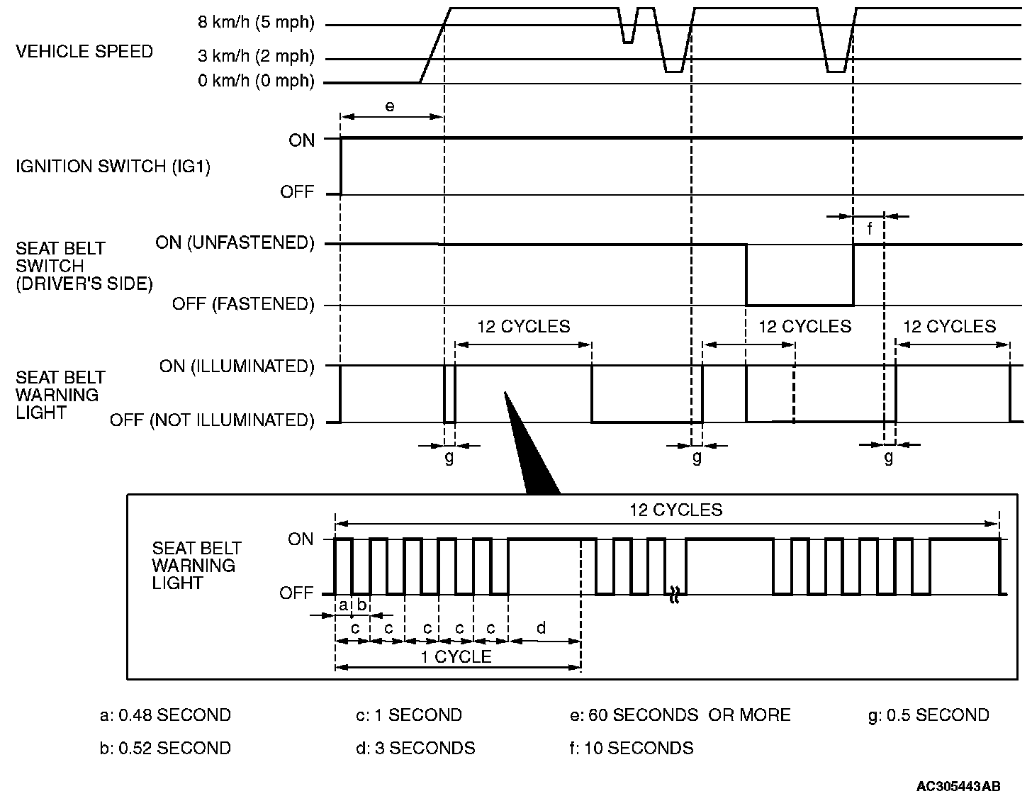 b. The seat belt switch has been turned on (driver's seat belt has not been fastened) at least 10 seconds while the ignition has been turned "ON" and the vehicle has been 8 km/h (5 mph) or more.