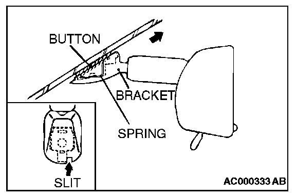 Insert a narrow flat-tip screwdriver into the slit in the inside rear view mirror bracket, keep the spring pushed in and remove the inside rear view mirror in the direction of the arrow in the illustration.