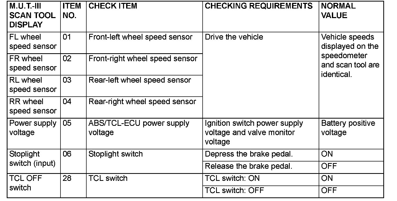 The following items can be read by the scan tool from the ABS/TCL-ECU input data.
