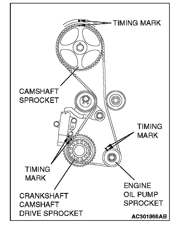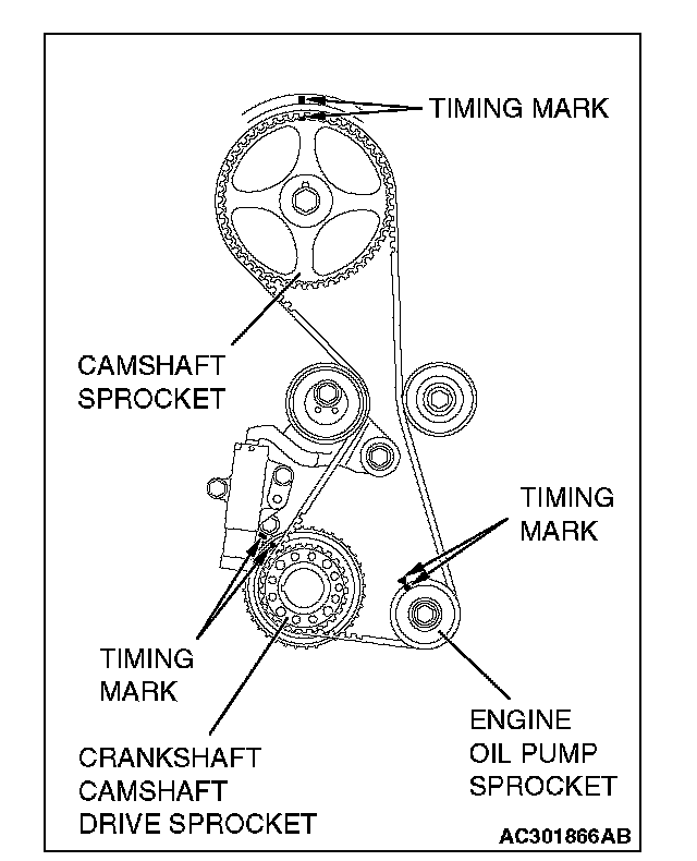 1. Align the timing marks on the camshaft sprocket, crankshaft camshaft drive sprocket and engine oil pump sprocket.