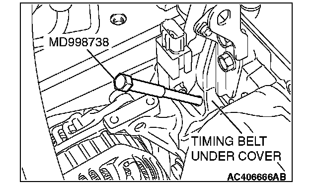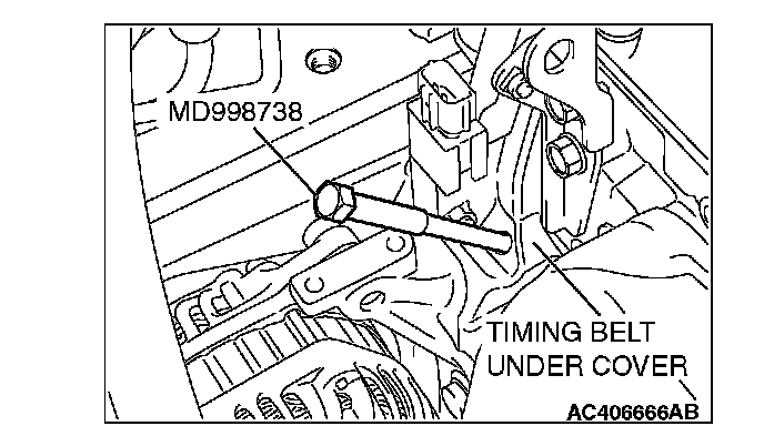 CAUTION: Special tool MD998738 must be gradually installed at a rate of 30 degrees per second. If it is screwed in all at once, the timing belt tensioner adjuster rod will not easily retract and special tool MD998738 may bend.