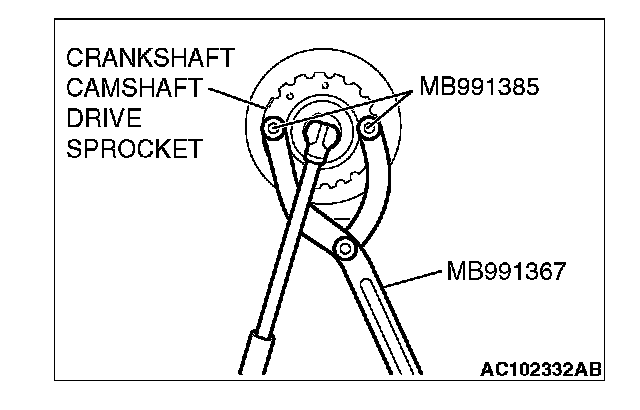 1. Hold the crankshaft camshaft drive sprocket with special tools MB991367 and M13991385.