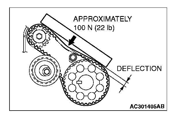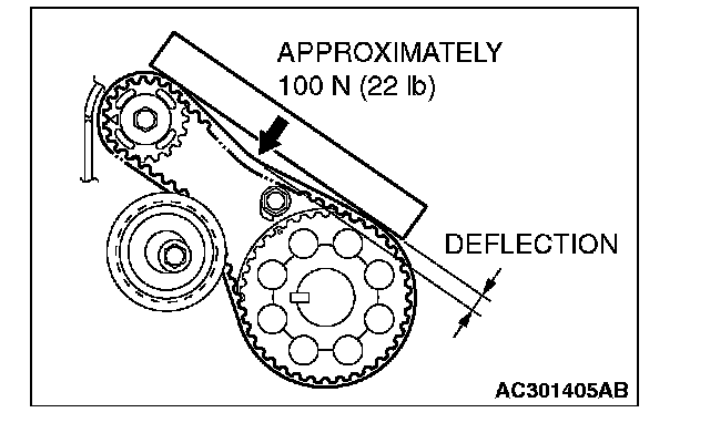 3. Apply a pressure of approximately 100 N (22 pounds) at the center (arrow area) between the sprocket as shown in the figure, then inspect whether the belt deflection is within the standard value.
