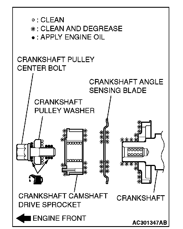 1. Clean or degrease the crankshaft, the crankshaft angle sensing blade, the crankshaft camshaft drive sprocket and crankshaft pulley washer as shown.