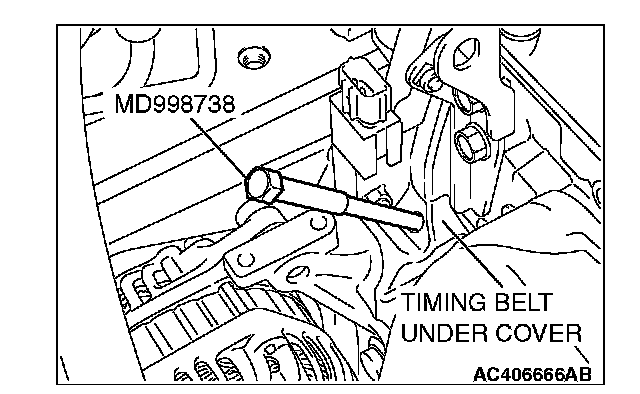 2. Remove the timing belt under cover rubber plug and then set special tool MD998738.