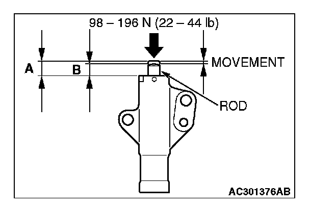 3. Hold the timing belt tensioner adjuster by hand, and press the top end of the rod onto the metal (e.g. cylinder block) with 98-196 N (22-44 pounds) of pressure, and measure the movement of the rod.