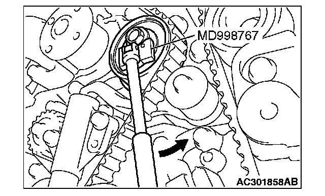 4. Turn the timing belt tensioner pulley in the direction shown in the figure using special tool MD998767 to apply tension to the valve timing belt. Then temporarily tighten and fix the timing belt tensioner pulley mounting bolt.