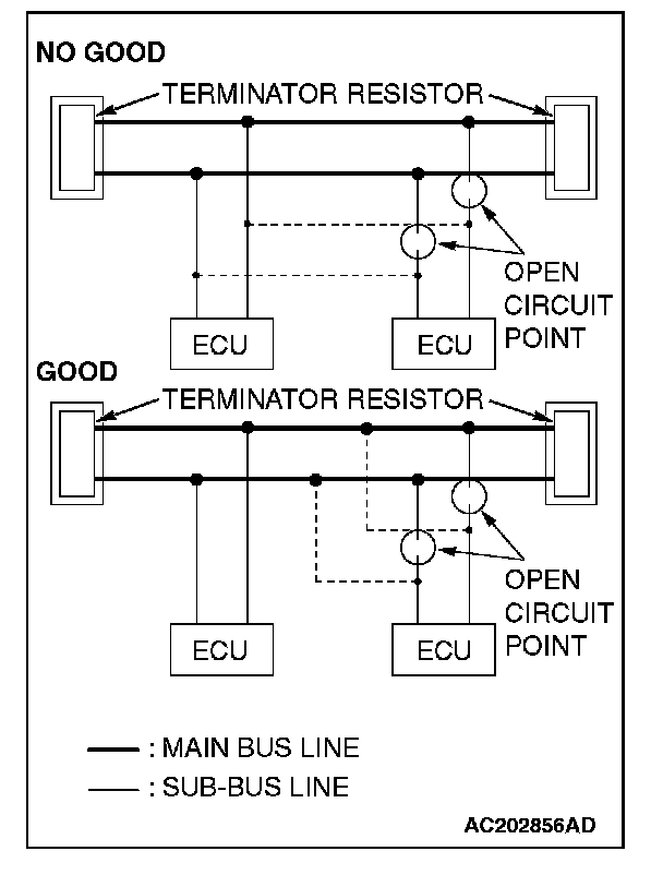 - If a sub-bus line is repaired, splice a new wire directly into the main bus line. If a new wire is spliced into the sub-bus line, which is connected to another device, the CAN communication will be disabled.