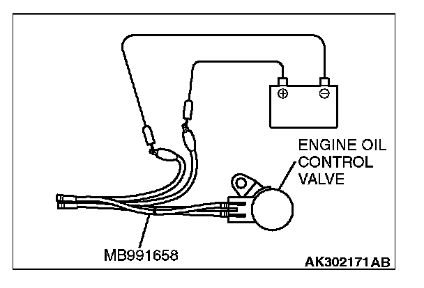 2. Check that the operation sound of the engine oil control valve can be heard when the positive battery voltage is supplied to the engine oil control valve. (Use the jumper wires to connect terminal No. 2 of the engine oil control valve connector to the positive battery terminal and terminal No. 1 to the negative battery terminal.)