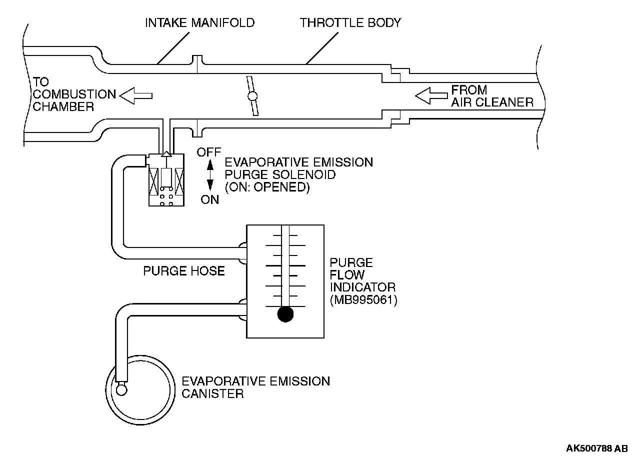 1. Disconnect the purge hose from the evaporative emission (EVAP) purge solenoid, and connect special tool MB995061 between the EVAP purge solenoid and the purge hose.