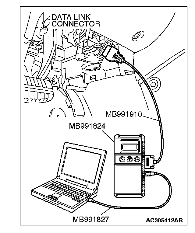 CAUTION: To prevent damage to scan tool MB991958, always turn the ignition switch to the "LOCK" (OFF) position before connecting or disconnecting scan tool MB991958.