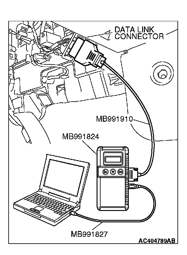 CAUTION: To prevent damage to scan tool MB991958, always turn the ignition switch to the "LOCK" (OFF) position before connecting or disconnecting scan tool MB991958.