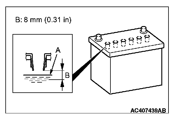 1. Ensure that the battery electrolyte level A within the range B shown in the figure. Add if the level is lower than the specified range.