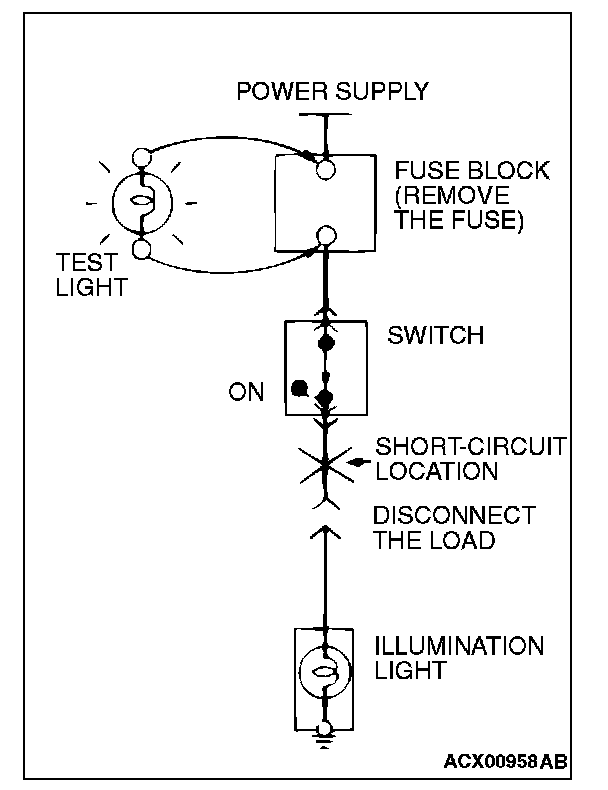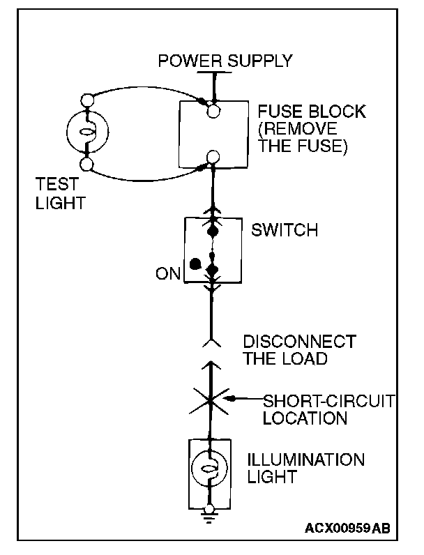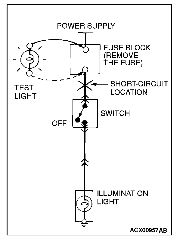STEP 1. Remove the blown fuse and connect the test light across the fuse terminals (Circuit switch: OFF).
