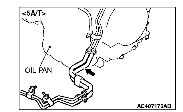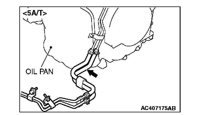 1. Disconnect the hose shown in the illustration which connects the transaxle and the oil cooler (inside the radiator). Place a container under the hose to collect the discharge.