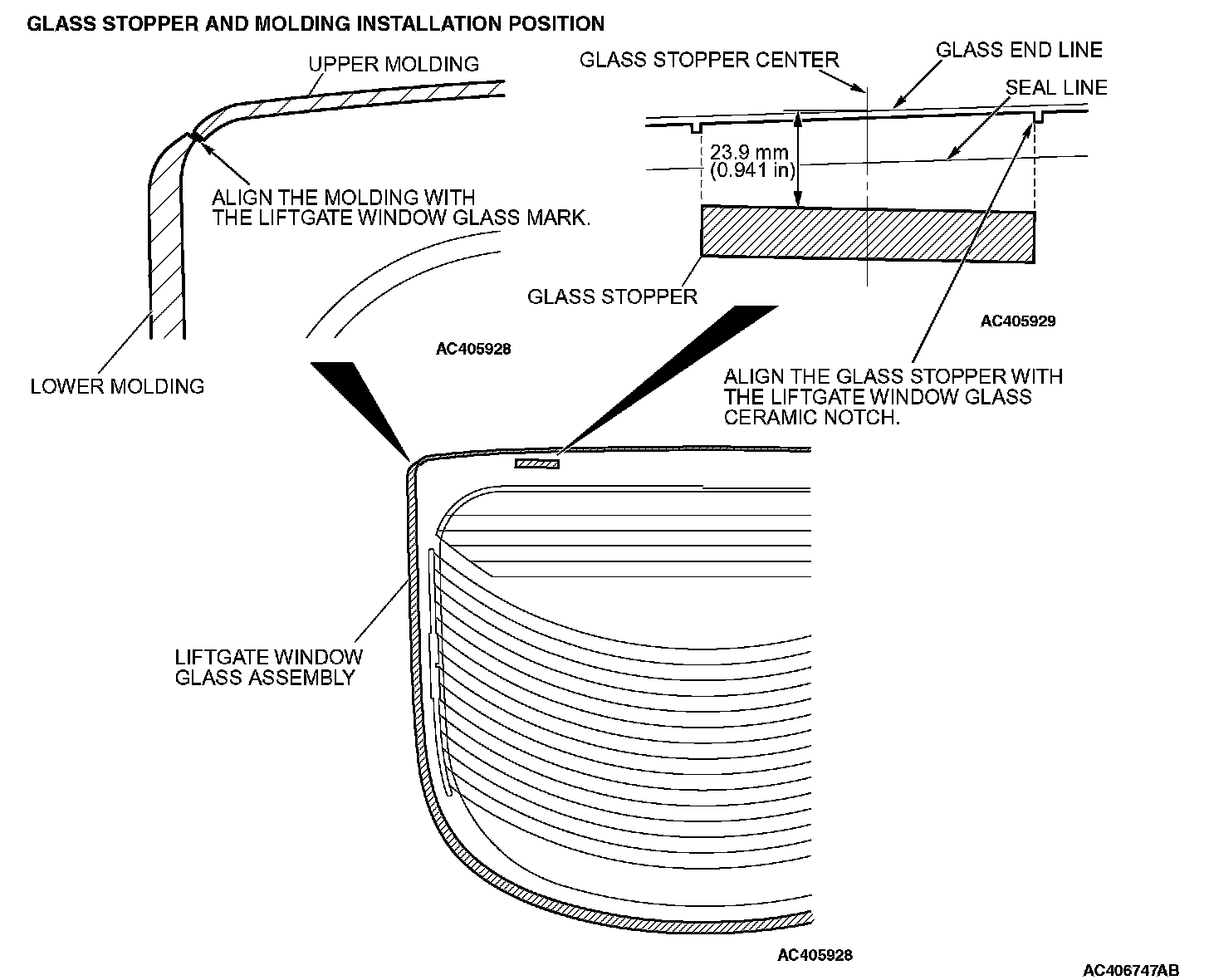 2. Assemble the glass stopper, lower molding and upper molding to specified positions on the liftgate window glass.