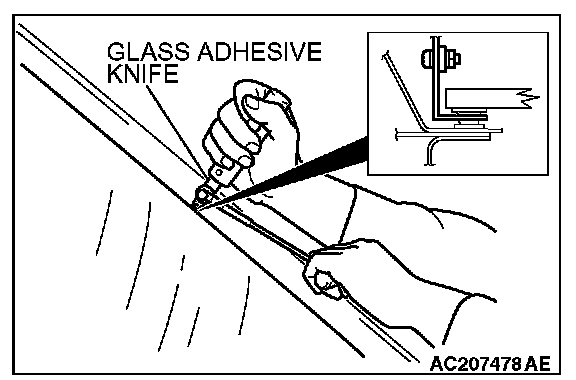 CAUTION: Inserting the glass adhesive knife too deeply into windshield adhesive may damage windshield.