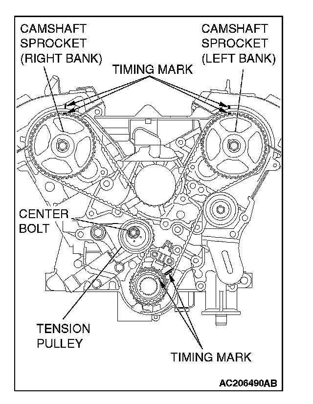 3. Turn the camshaft sprocket (Right bank) counterclockwise until the tension side of the timing belt is firmly stretched. Check all the timing marks again.