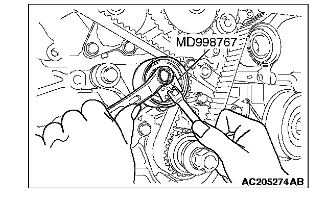 4. Use special tool MD998767 to push the tensioner pulley into the timing belt, then temporarily tighten the center bolt.