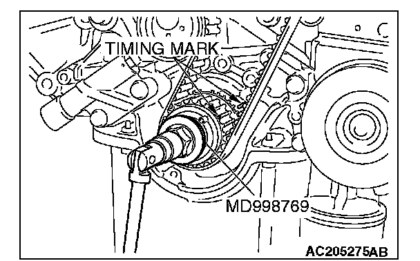 5. Use special tool MD998769 to turn the crankshaft 1/4 turn counterclockwise, then turn it again clockwise until the timing marks are aligned.