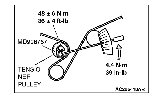 6. Loosen the center bolt of the tensioner pulley. Use special tool MD998767 and a torque wrench to apply the tension torque to the timing belt as shown in the illustration. Then tighten the center bolt to the specified torque.