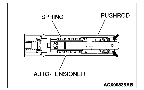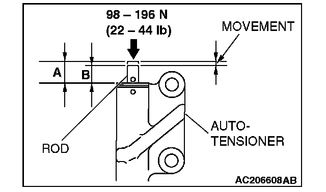 3. While holding the auto-tensioner with your hand, press the end of the pushrod against a metal surface (such as the cylinder block) with a force of 98-196 N (22-44 pound) and measure how far the pushrod is pushed in.