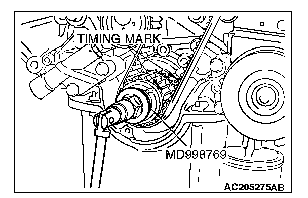 CAUTION: The camshaft sprocket (right bank) can turn easily due to the spring force applied, so be careful not to get your fingers caught.