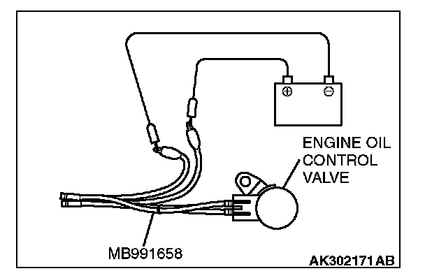 2. Check that the operation sound of the engine oil control valve can be heard when the positive battery voltage is supplied to the engine oil control valve. (Use the jumper wires to connect terminal No. 2 of the engine oil control valve connector to the positive battery terminal and terminal No. 1 to the negative battery terminal.)