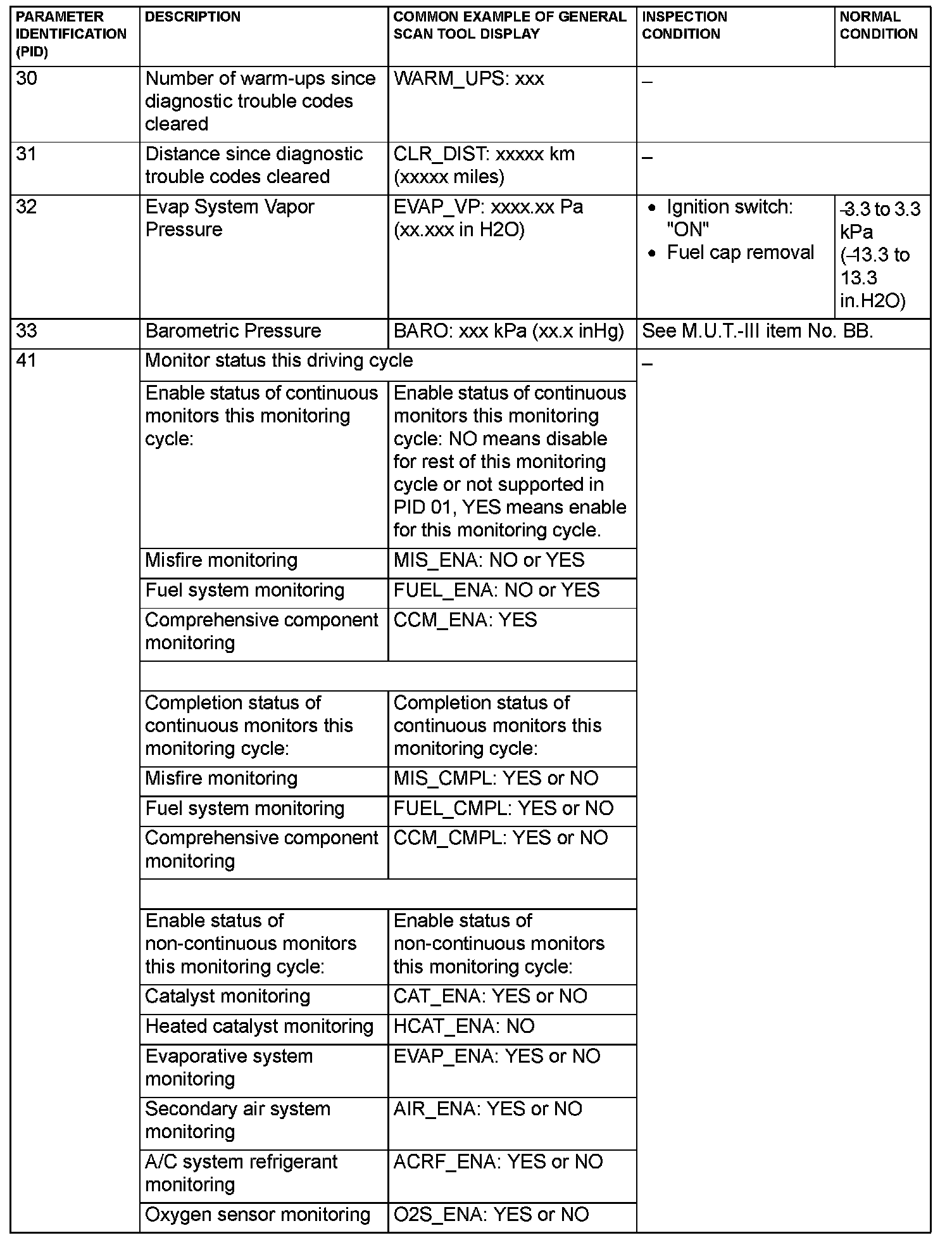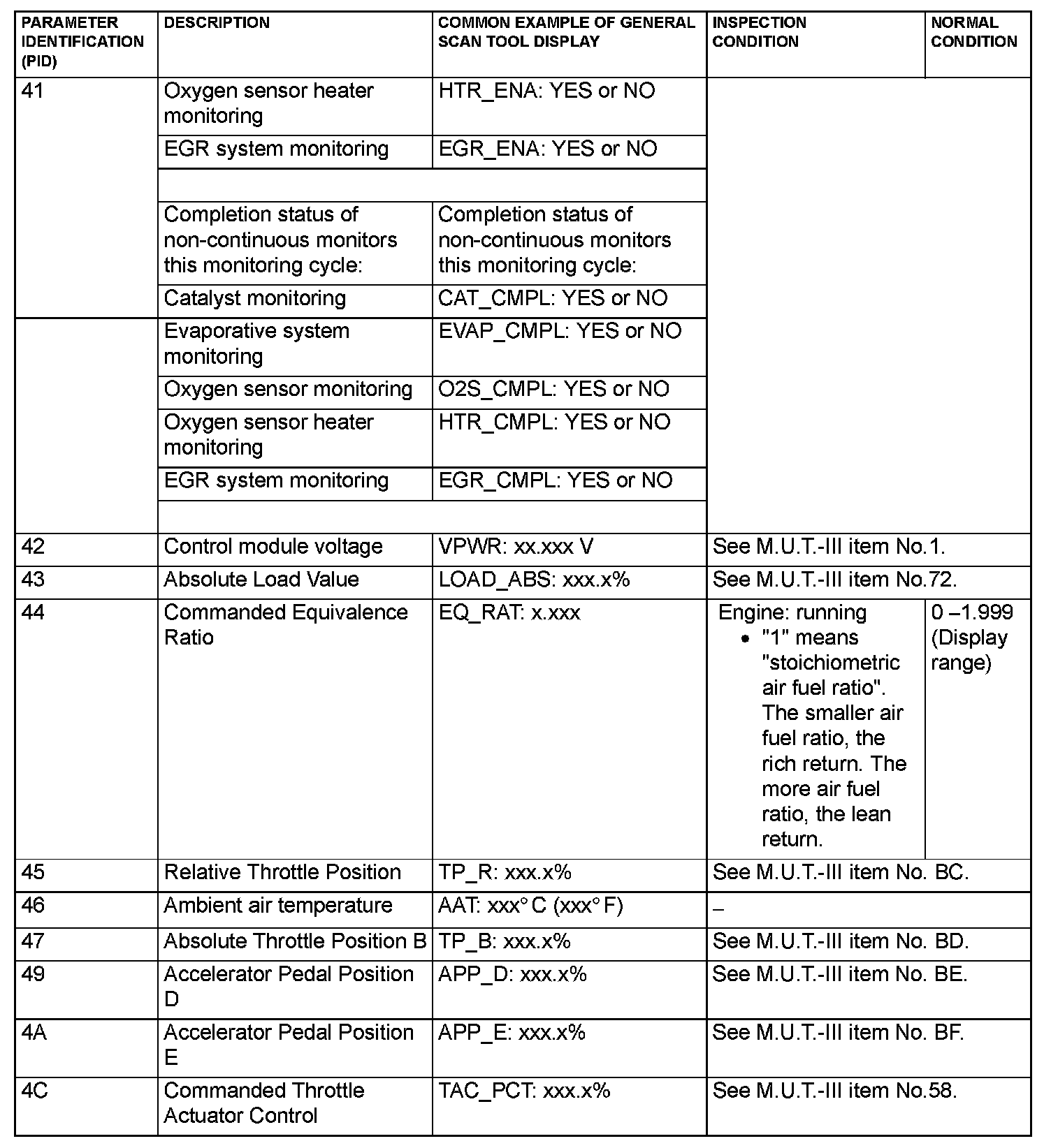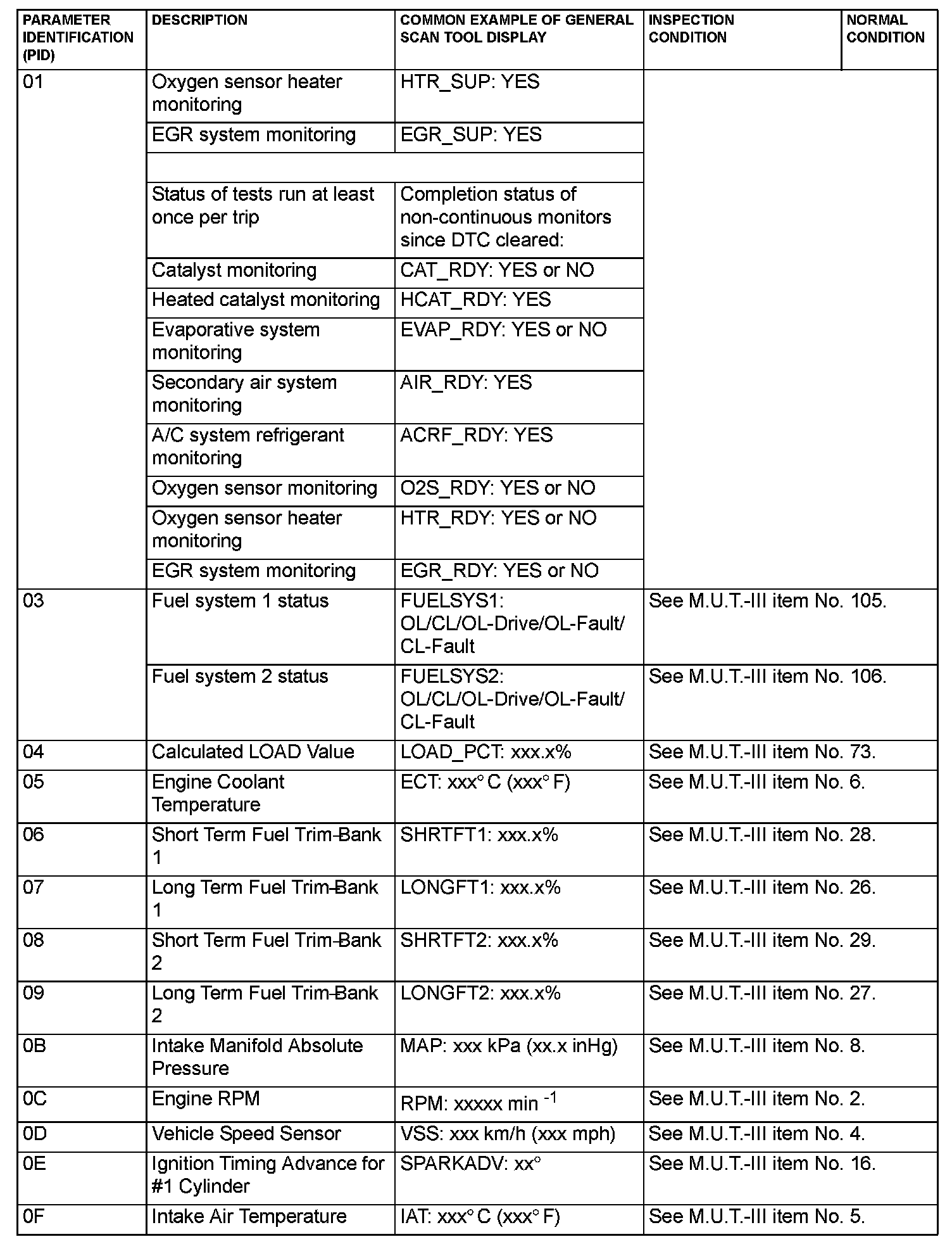 GENERAL SCAN TOOL (GST) MODE 01 REFERENCE TABLEThe purpose of this service of to allow access to current emission-related data values, including analogue inputs and outputs, digital inputs and outputs, and system status information.