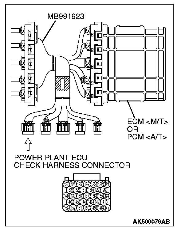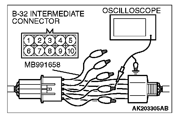 1. Disconnect the intermediate connector B-32, and connect the test harness special tool (MB991658) between the separated connector.
