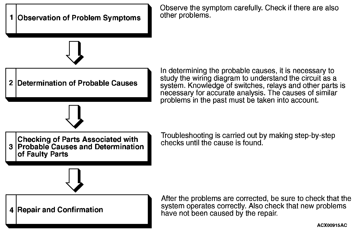 If an attempt is made to solve a problem without going through correct steps for troubleshooting, the symptoms could become more complicated, resulting in failure to determine the causes correctly and making incorrect repairs. The four steps given should be followed in troubleshooting.