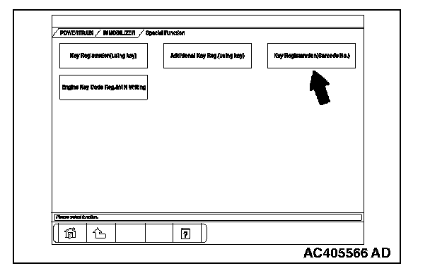 ENCRYPTED CODE REGISTRATION USING BARCODE NO.When the ignition key that starts the engine is replaced due to the replacement of the ignition key set, the ignition key cylinder, etc., the barcode No. must be used to register encrypted codes.