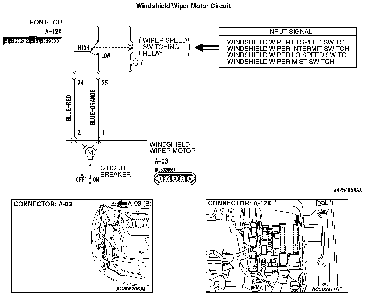 STEP 5. Check the wiring harness between windshield wiper motor connector A-03 (terminals 1 and 2) and front-ECU connector A-12X (terminals 25 and 24).