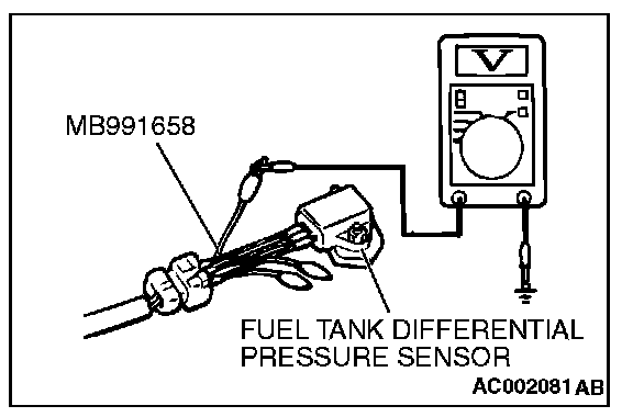 1. Disconnect the fuel tank differential pressure sensor connector and connect special tool MB991658 between the terminals of the disconnected connector.