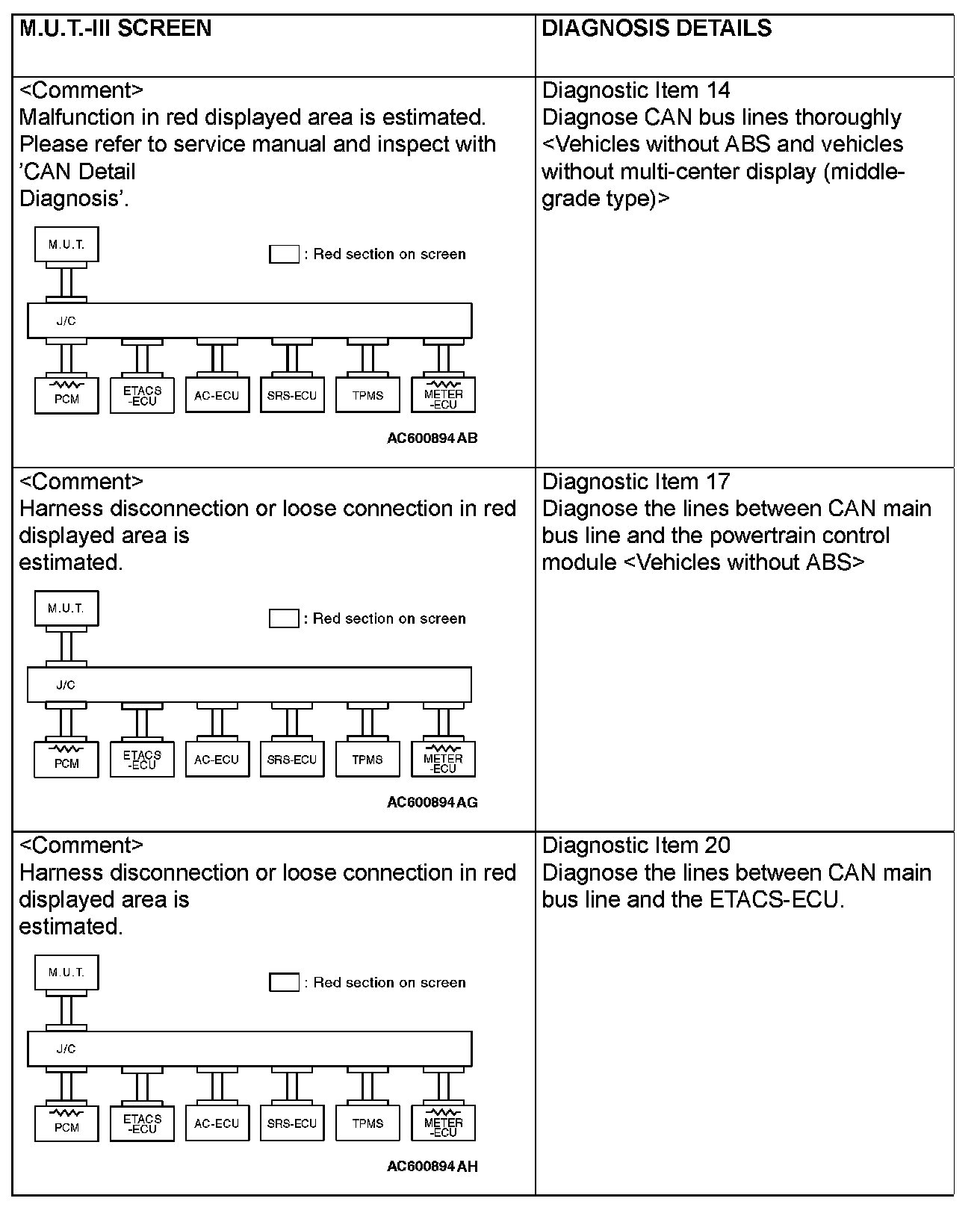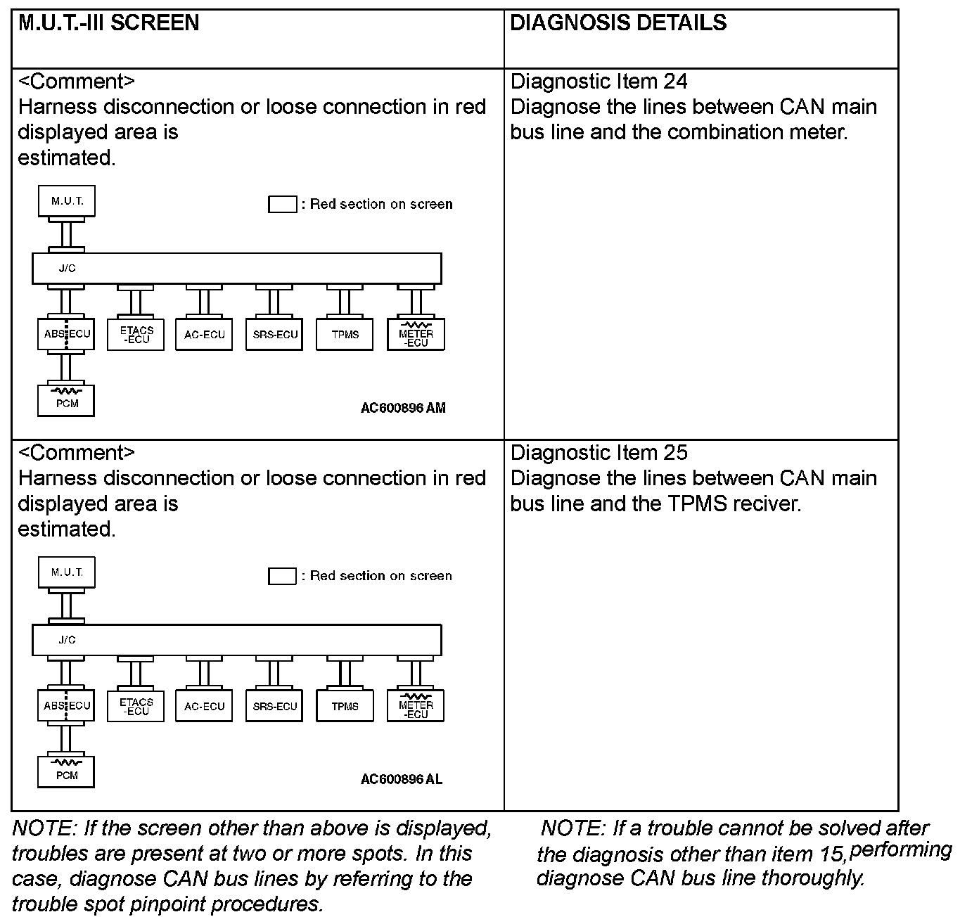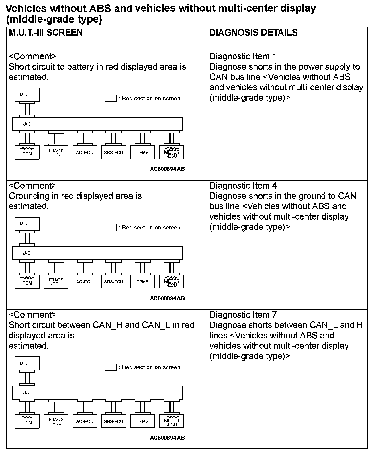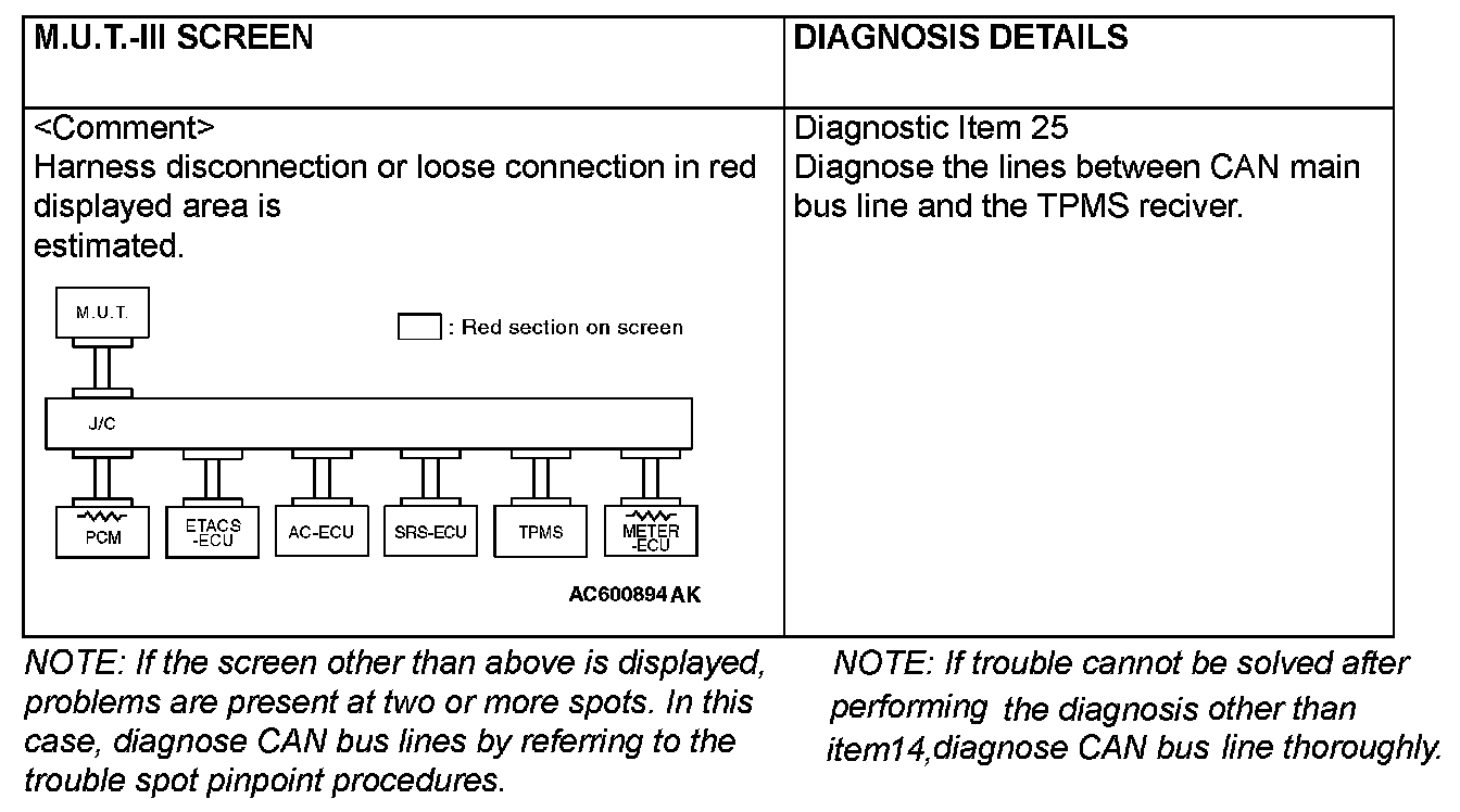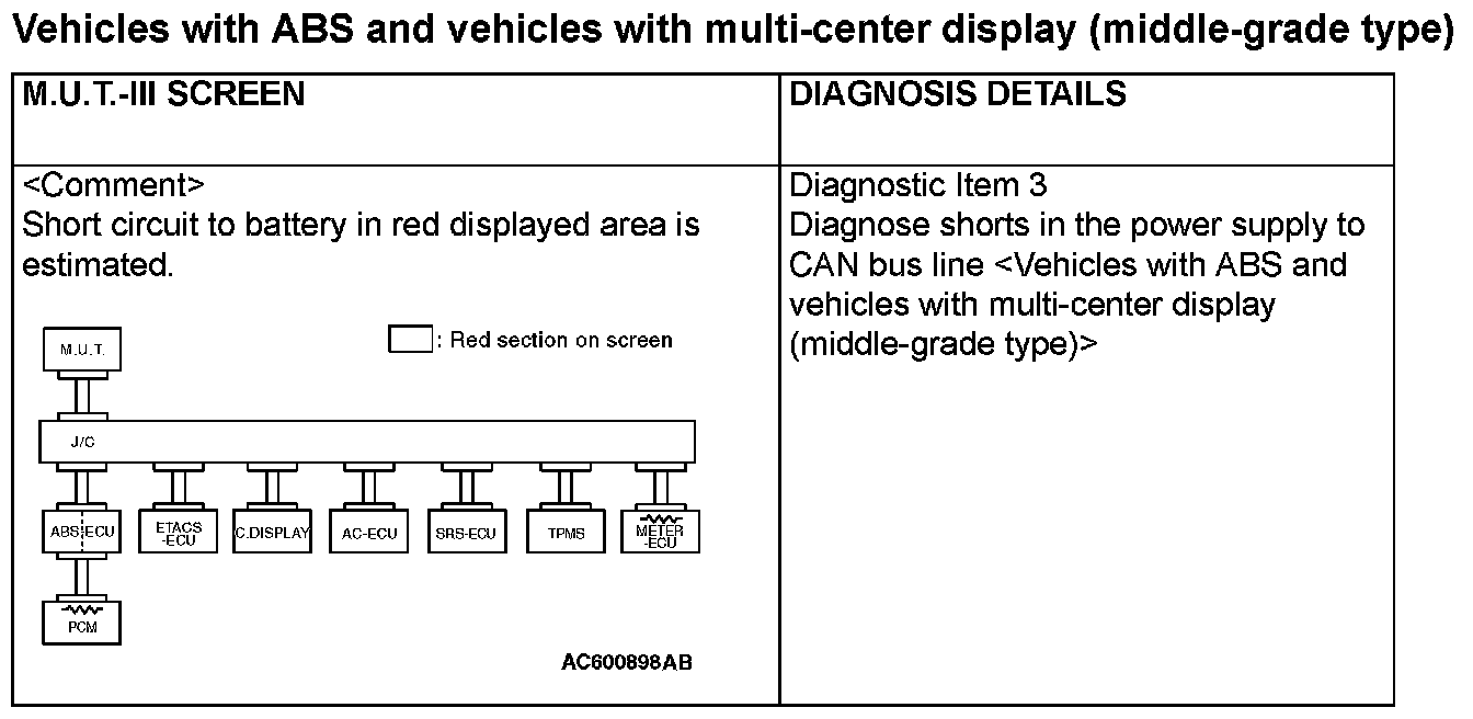 CAN BUS DIAGNOSTICS TABLEThis diagnosis applies only to the CAN bus lines. If a different system is defective, proceed to the applicable diagnosis section for each system. Observe the diagnosis procedure below only when the CAN bus line is defective.