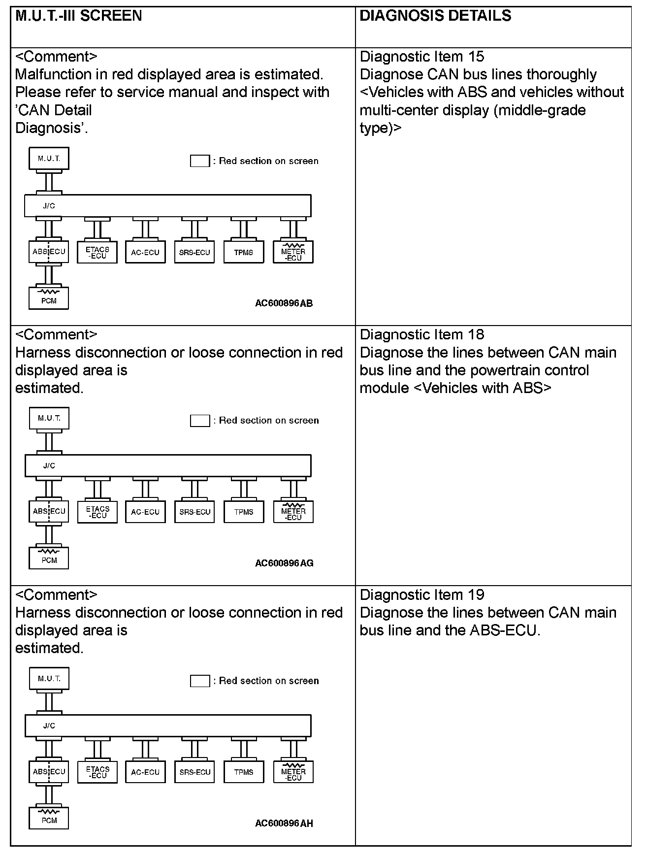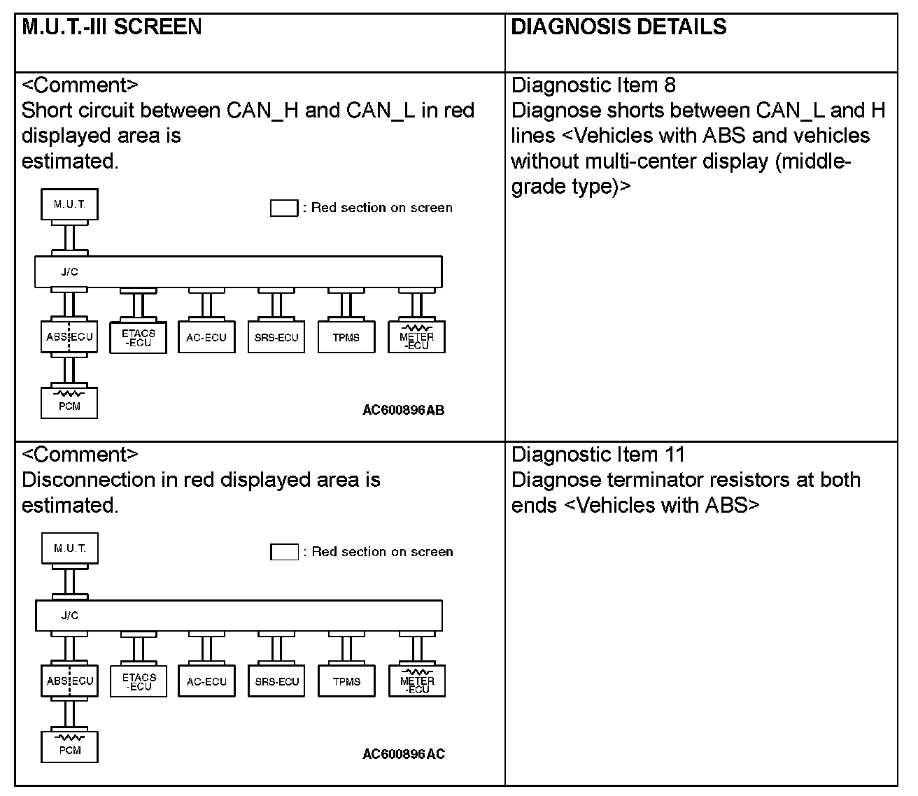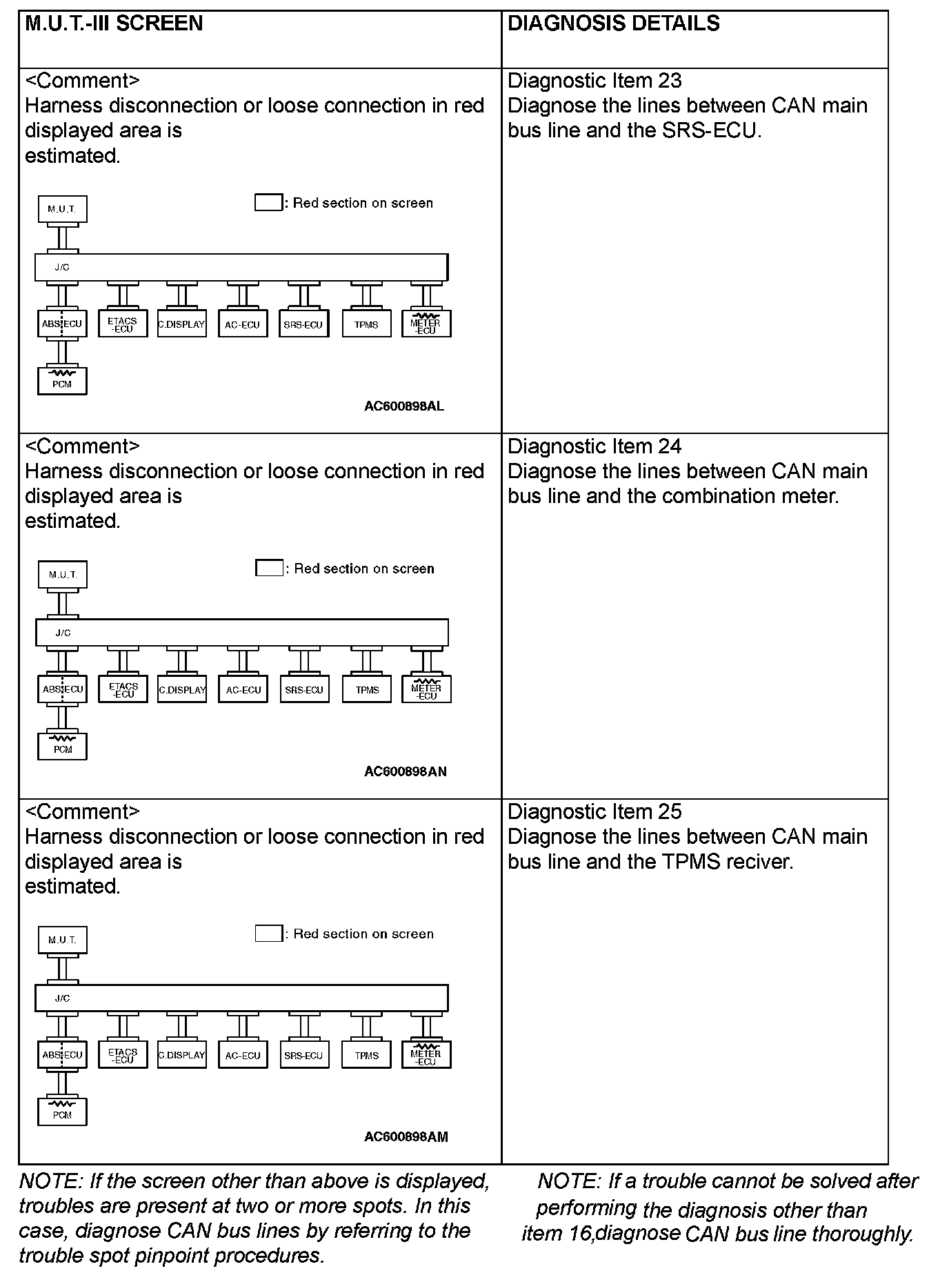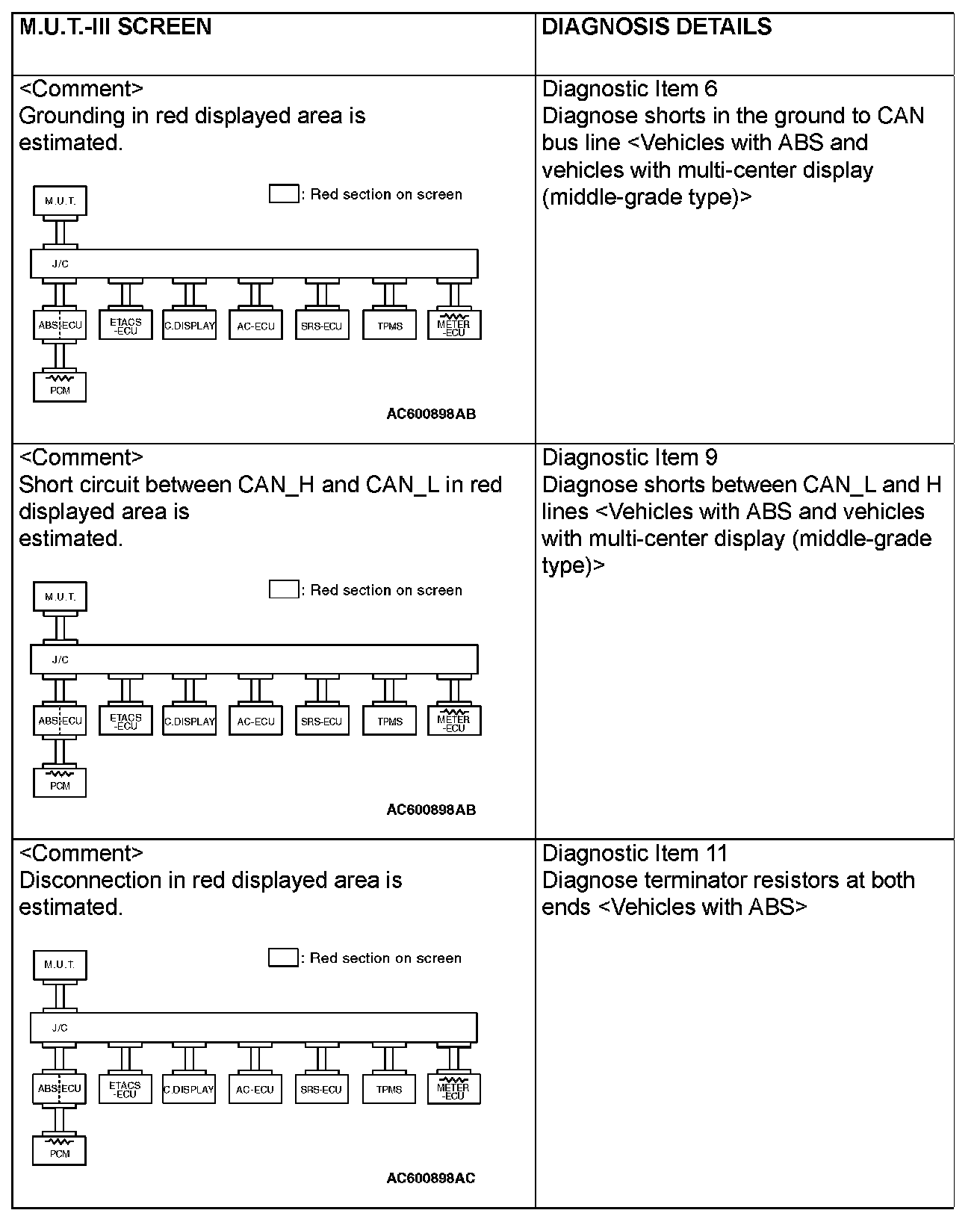CAN BUS DIAGNOSTICS TABLEThis diagnosis applies only to the CAN bus lines. If a different system is defective, proceed to the applicable diagnosis section for each system. Observe the diagnosis procedure below only when the CAN bus line is defective.