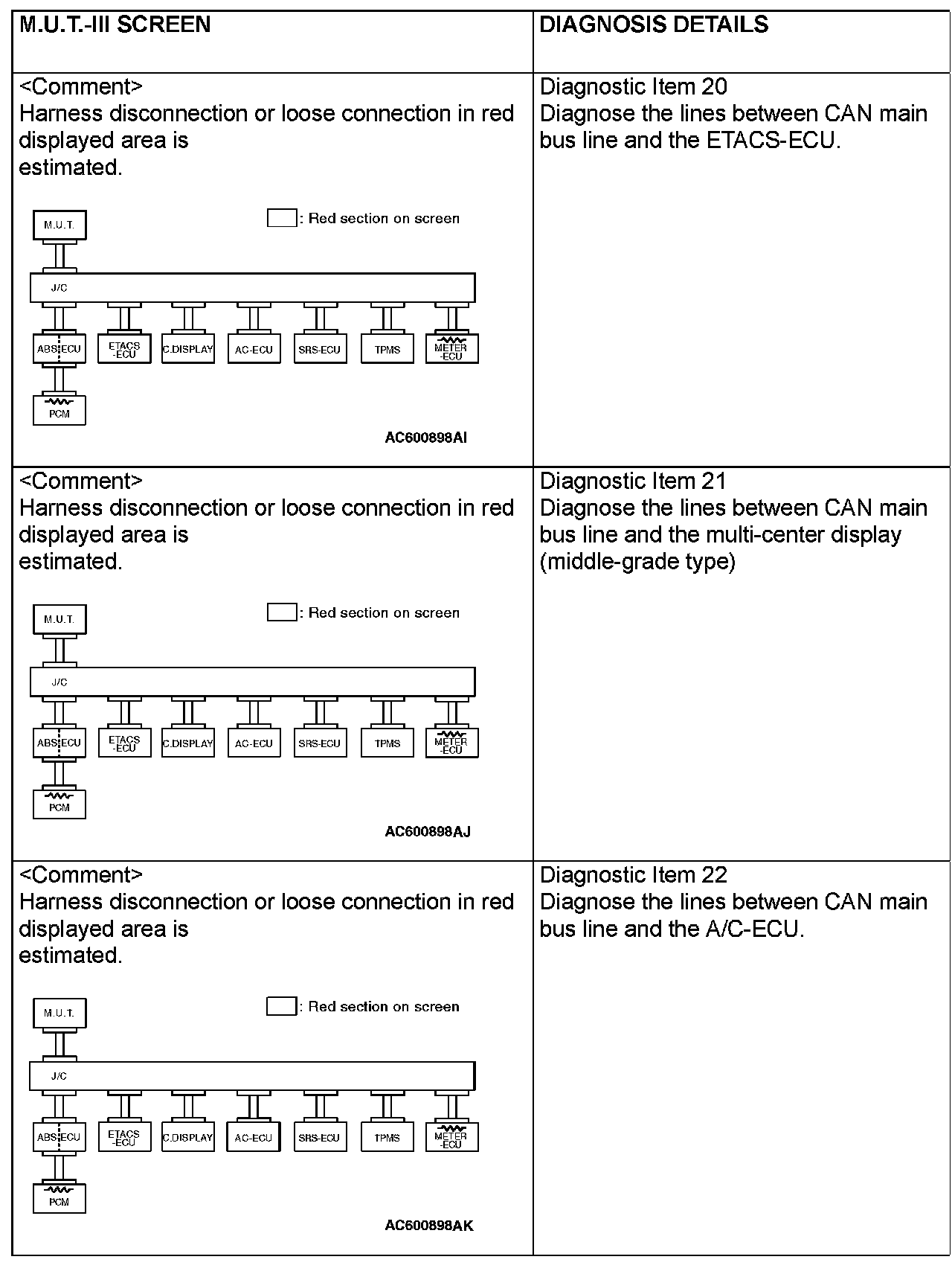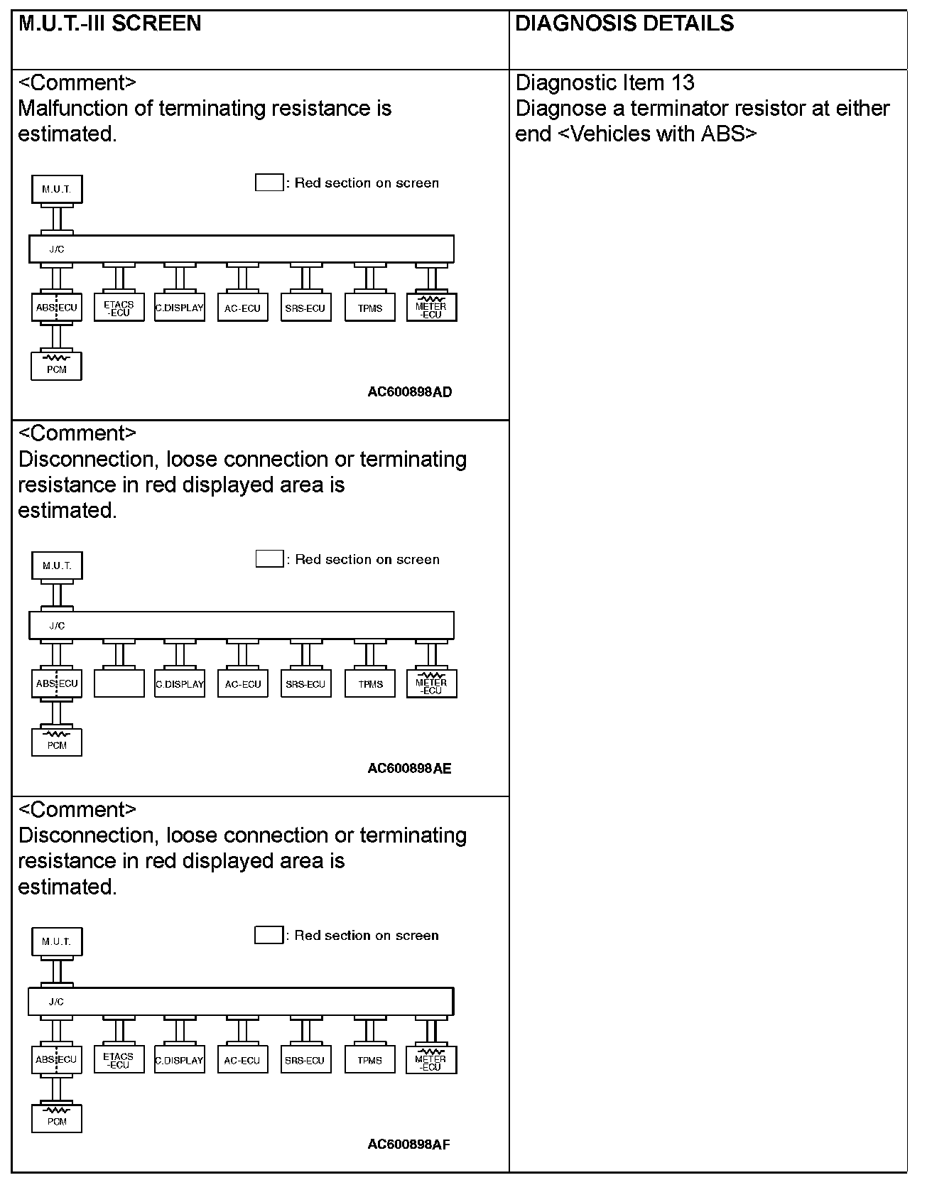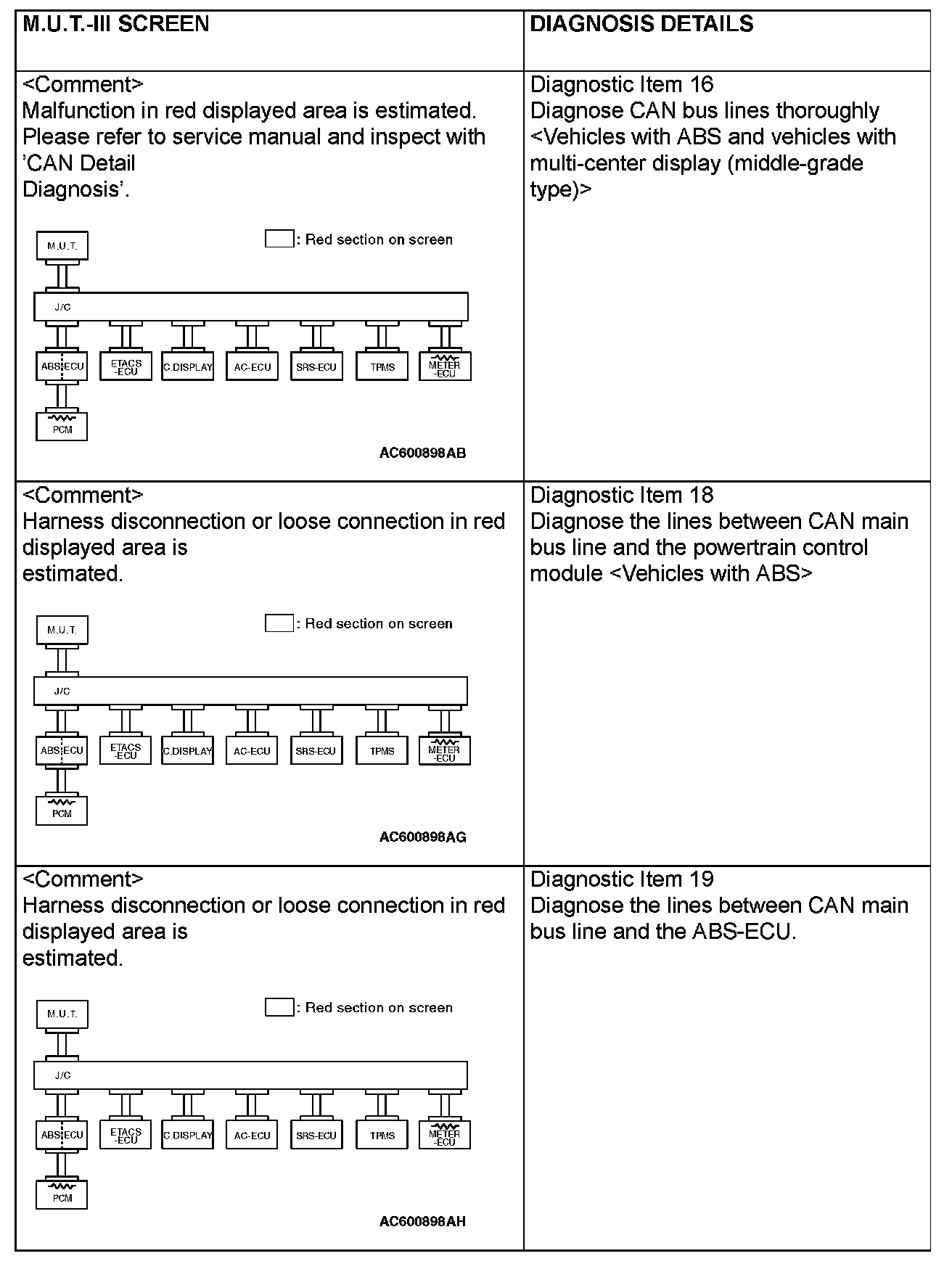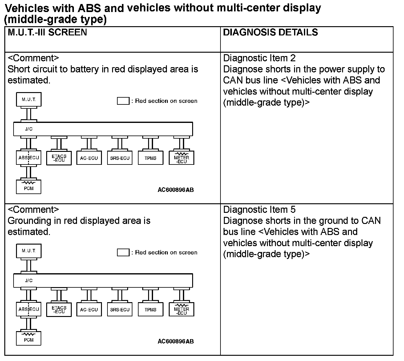 CAN BUS DIAGNOSTICS TABLEThis diagnosis applies only to the CAN bus lines. If a different system is defective, proceed to the applicable diagnosis section for each system. Observe the diagnosis procedure below only when the CAN bus line is defective.