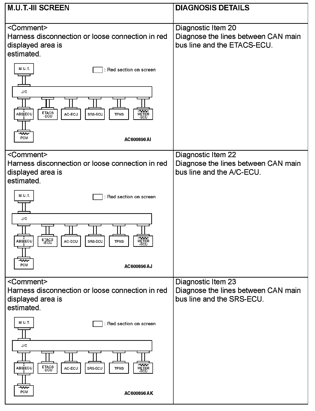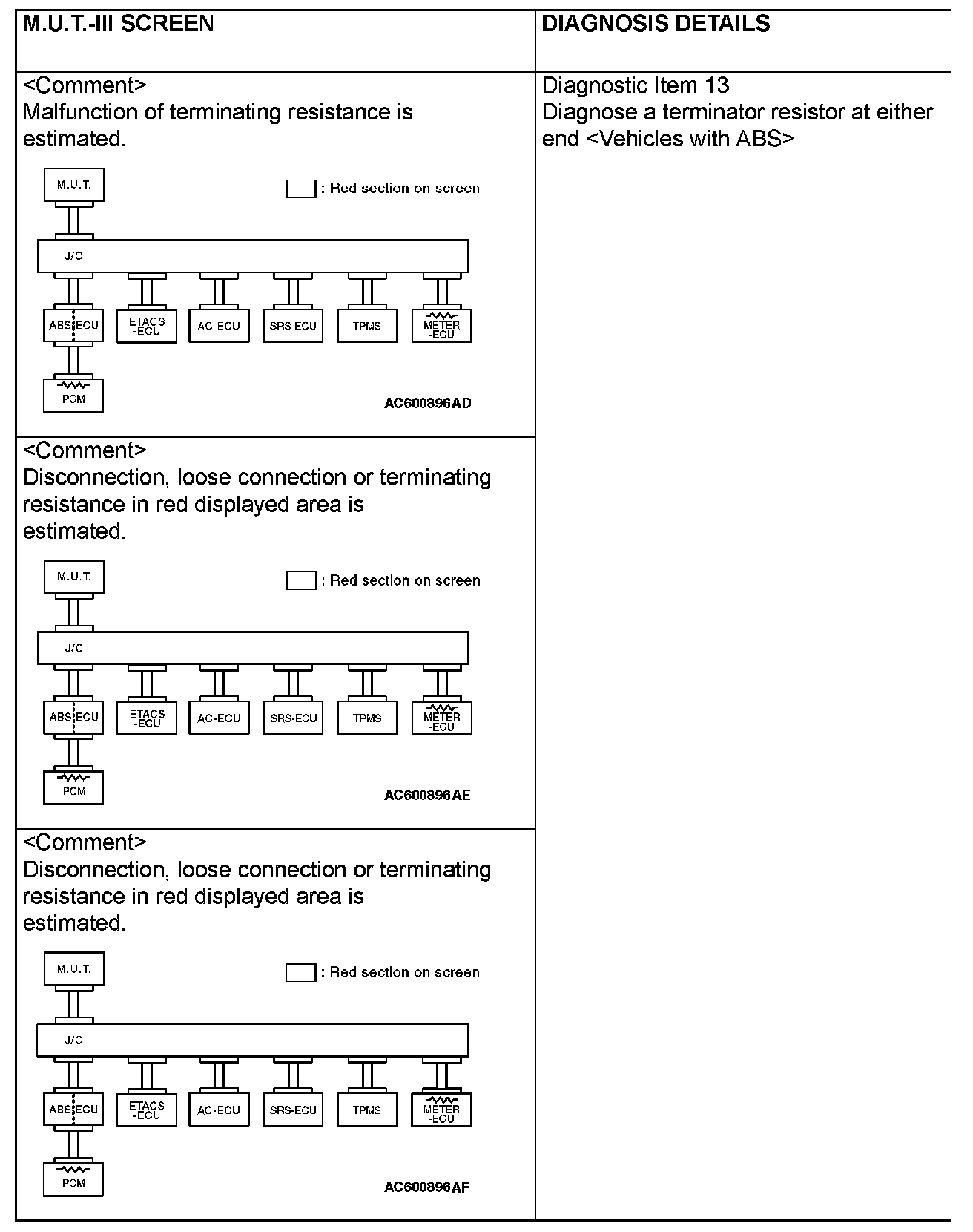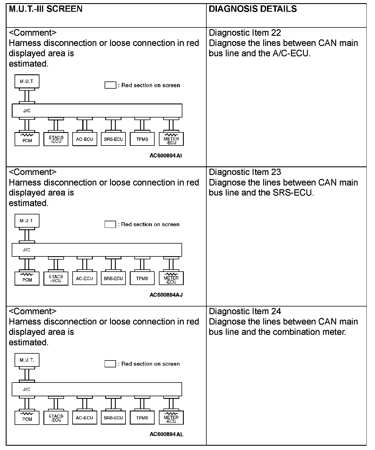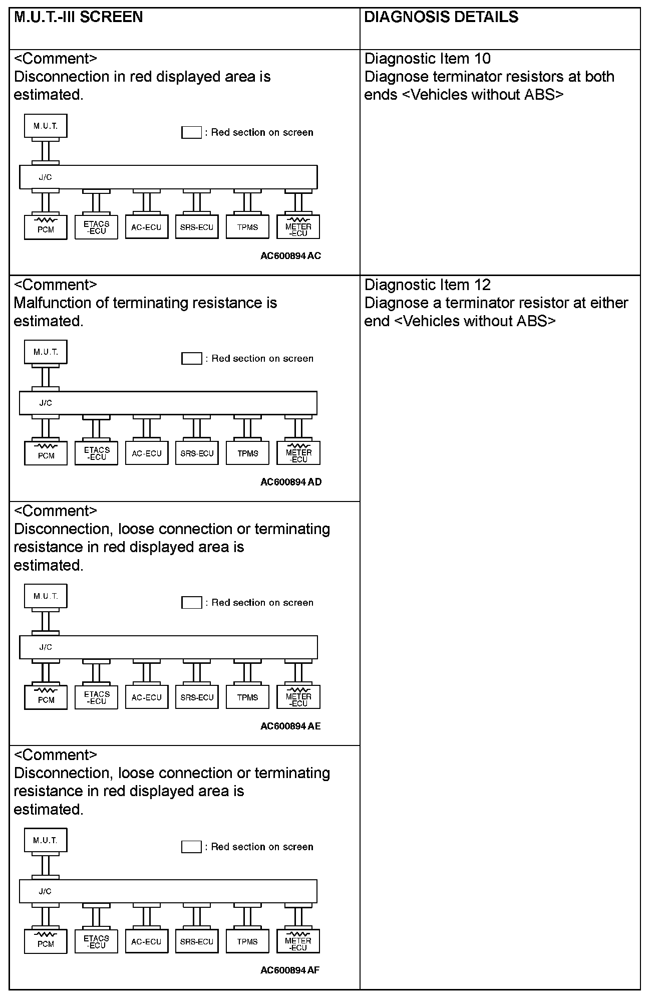 CAN BUS DIAGNOSTICS TABLEThis diagnosis applies only to the CAN bus lines. If a different system is defective, proceed to the applicable diagnosis section for each system. Observe the diagnosis procedure below only when the CAN bus line is defective.