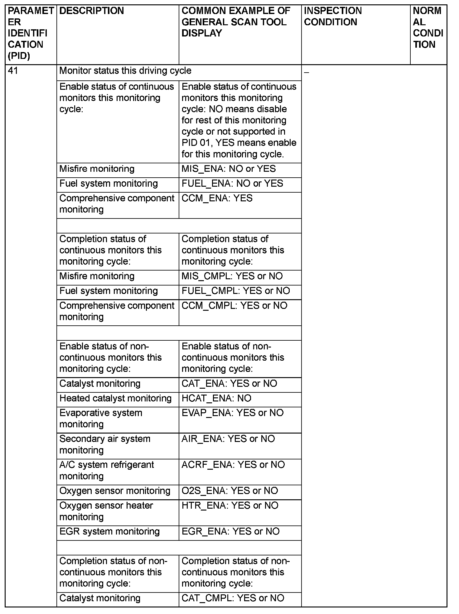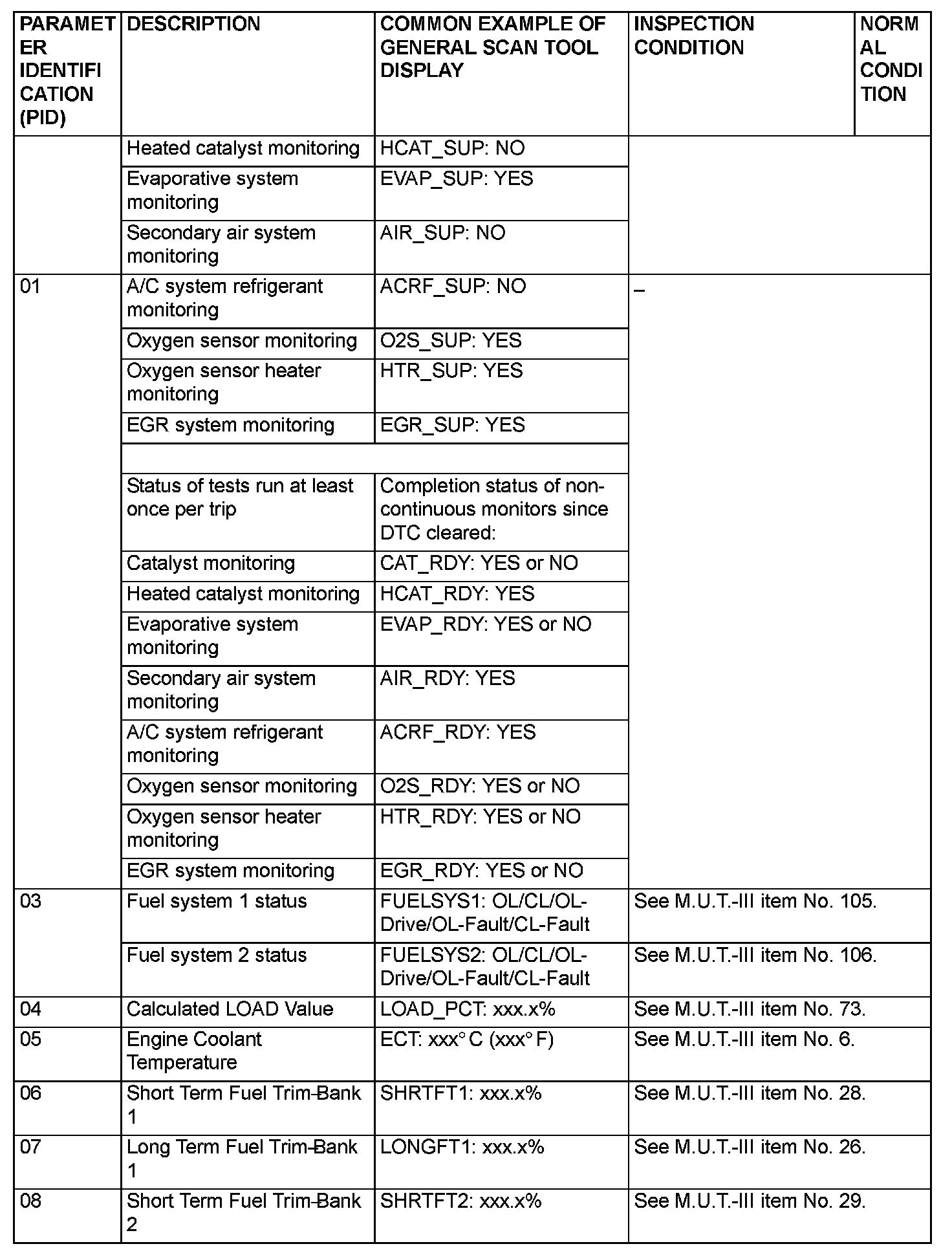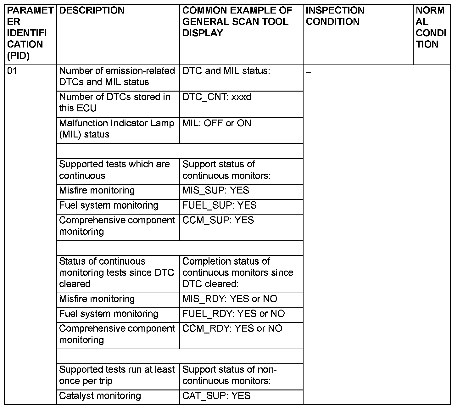 GENERAL SCAN TOOL (GST) MODE 01 REFERENCE TABLEThe purpose of this service of to allow access to current emission-related data values, including analogue inputs and outputs, digital inputs and outputs, and system status information.