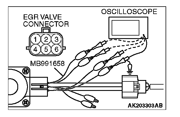 2. Connect the oscilloscope probe to the EGR valve connector terminal No. 1, terminal No. 3, terminal No. 4, terminal No. 6 respectively.