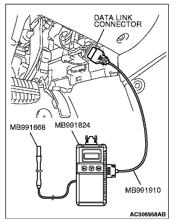CAUTION: To prevent damage to scan tool MB991958, always turn the ignition switch to the "LOCK" (OFF) position before connecting or disconnecting scan tool MB991958.