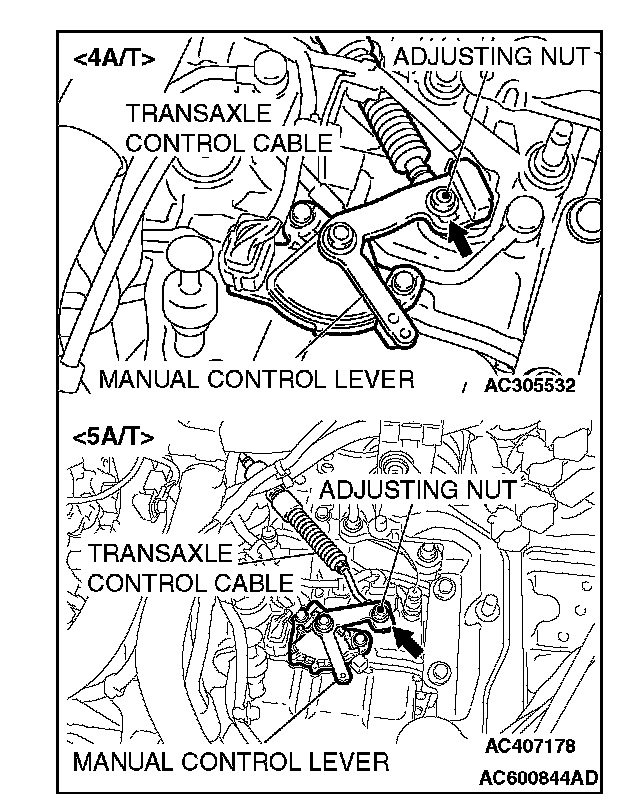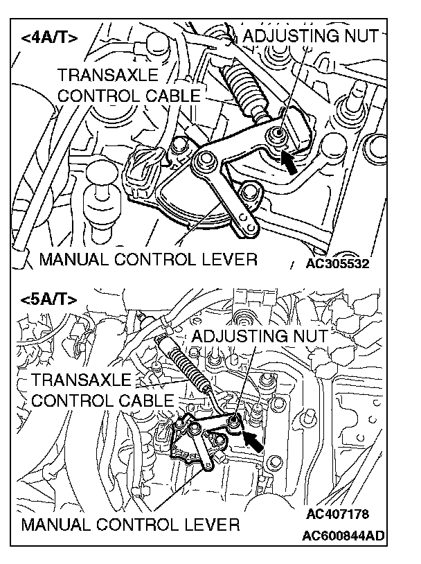 6. Gently push the transaxle control cable in the direction of the arrow, until the cable is taut. Tighten the adjusting nut.