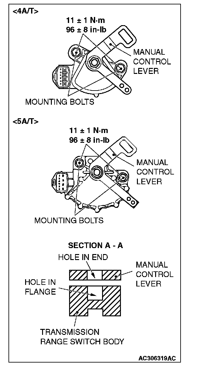 NOTE: The transmission range switch body can be aligned by inserting a 5-mm diameter steel bar into the end hole of the manual control lever and the flange hole of the transmission range switch body.