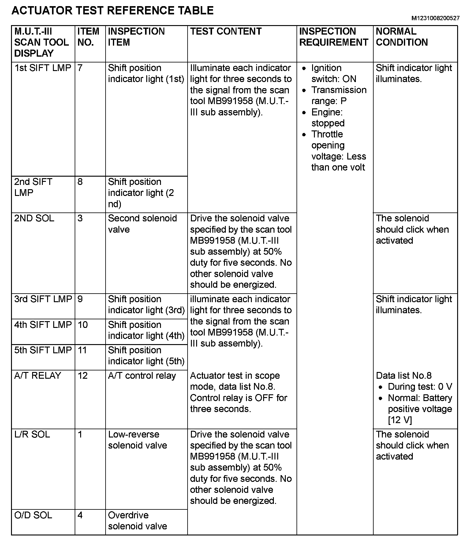 ACTUATOR TEST REFERENCE TABLE (Part 2):