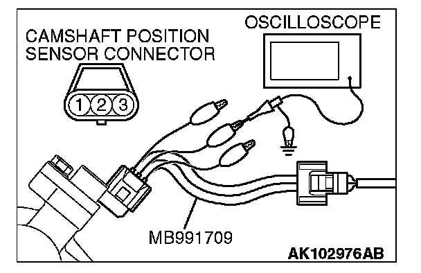 1. Disconnect the camshaft position sensor connector, and connect the test harness special tool (MB991709) between the separated connector (All terminals should be connected).
