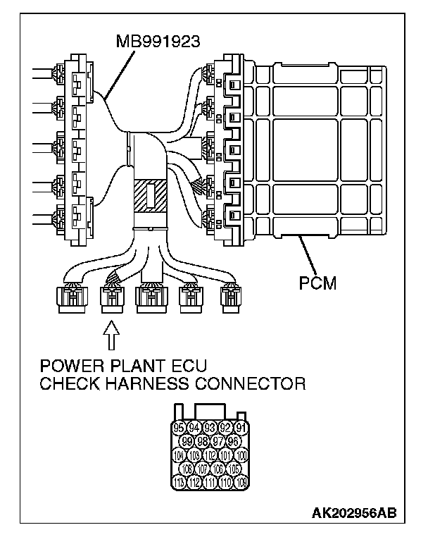 1. Disconnect all PCM connectors. Connect the check harness special tool (MB991923) between the separated connectors.