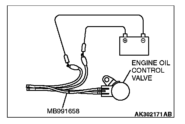 2. Check that the operation sound of the engine oil control valve can be heard when the positive battery voltage is supplied to the engine oil control valve. (Use the jumper wires to connect terminal No. 2 of the engine oil control valve connector to the positive battery terminal and terminal No. 1 to the negative battery terminal.)