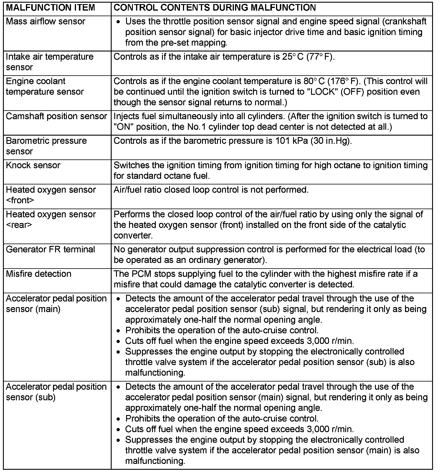 When the main sensor malfunctions are detected by the diagnostic test mode, the vehicle is controlled by means of the following defaults.
